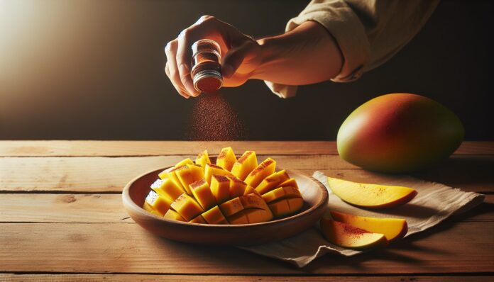 Sobre trozos de mango recién cortados, espolvoree una cucharadita de tajín para lograr un snack saludable y con mucho sabor. Este sencillo detalle potencia el gusto y aporta un toque exquisito.